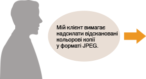 Зазначте адресу електронної пошти вашого клієнта, установивши для параметра сканування <File Format> значення <JPEG>, і зареєструйте адресу й параметри як комбінацію в списку <Favorite Settings>. Відтепер ви зможете за потреби скористатися цією комбінацією параметрів. Реєстрація часто використовуваних параметрів сканування (електронна пошта/інтернет-факс/спільна папка/FTP-сервер)