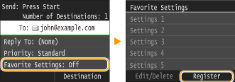 Щоб відредагувати або видалити зареєстровані параметри, виберіть <Scan>  <E-Mail>/<I-Fax>/<File>  <Favorite Settings>  <Edit/Delete>  <Edit> або <Delete> і виконайте наведені нижче дії.