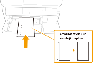 Šajā sadaļā aprakstīta aplokšņu ievietošana vajadzīgajā orientācijā un procedūras, kas jāveic pirms aplokšņu ievietošanas. Vispārīgas procedūras aprakstu, kā aploksnes ievietot daudzfunkciju papīrturī, skatiet sadaļā Ievietojiet papīru daudzfunkciju papīrturī.