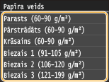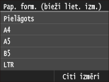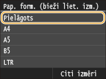 Ja iepriekš redzamais ekrāns netiek rādīts, ievietojot papīruJa daudzfunkciju papīrturī vienmēr ievietojat vienu un to pašu papīra formātu, varat izlaist papīra iestatīšanas darbības, reģistrējot papīra formātu un veidu kā noklusējuma iestatījumu. Reģistrējot noklusējuma iestatījumu, iepriekš redzamais ekrāns netiek parādīts. Lai parādītu ekrānu, izvēlieties<Norādīt, ievietojot papīru> (Noklusējuma papīra iestatījumu reģistrēšana daudzfunkciju papīrturim).
