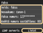 <Faksa iestatījumi>. Tomēr iestatījumi, kas veikti no vienuma <Adrešu grāmata>, ir aktivizēti detalizētajiem adrešu grāmatā reģistrēto adresātu iestatījumiem. |