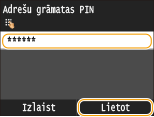 Ja adrešu grāmatai ir iestatīts PIN kods, importēšanas laikā tiek parādīts ekrāns <Adrešu grāmatas PIN>. Ievadiet adrešu grāmatas PIN un pieskarieties <Lietot>. Pieskarieties <Izlaist>, lai atceltu adrešu grāmatas datu importēšanu.