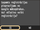 Iekārtu varat arī reģistrēt no mobilās ierīces vai pārlūkprogrammas Google Chrome*. Pirms reģistrēšana ir pabeigta, iekārtas displejā tiek parādīts tālāk redzamais apstiprinājuma ekrāns. Lai reģistrēšanu pabeigtu, nospiediet <Jā>.