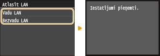 Kad esat izlēmis, vai iekārtas savienošanai ar datoru izmantosit vadu vai bezvadu LAN, darbības panelī izvēlieties vadu LAN vai bezvadu LAN. Ņemiet vērā — ja iestatījumus maināt no <Vadu LAN> uz <Bezvadu LAN> vai pretēji, jums ir jāatinstalē datorā instalētie MF draiveri un pēc tie jāinstalē vēlreiz. Papildinformāciju sk. dokumentā "MF Driver Installation Guide (MF draivera instalēšanas rokasgrāmata)."