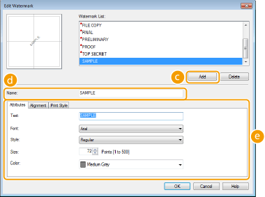 Noklikšķiniet uz katras cilnes, lai norādītu ūdenszīmes tekstu, krāsu vai drukāšanas pozīciju. Lai iegūtu papildinformāciju, printera draivera ekrānā noklikšķiniet uz [Help] (Palīdzība).
