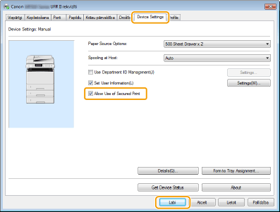 Noklikšķiniet uz cilnes [Device Settings] (Ierīces iestatījumi) un pārliecinieties, ka ir atzīmēta izvēles rūtiņa [Allow Use of Secured Print] (Atļaut drošās drukas izmantošanu).