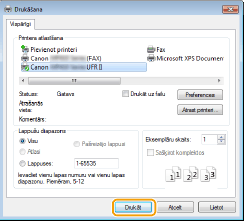 Izvēlieties šīs iekārtas printera draiveri un noklikšķiniet uz [Preferences] vai [Rekvizīti].