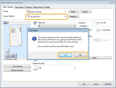 Izvēlieties [Secured Print] (Drošā druka) opcijā [Output Method] (Izvades metode).