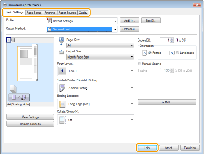 Noklikšķiniet uz cilnes [Basic Settings] (Pamatiestatījumi), [Page Setup] (Lappuses iestatījumi), [Finishing] (Apdare), [Paper Source] (Papīra avots) vai [Quality] (Kvalitāte), lai katrā ekrānā norādītu nepieciešamos drukāšanas iestatījumus.