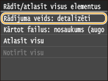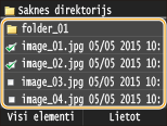 ![]() ![]() Ja izvēlaties iestatījumu <Datums/laiks (augoši)> vai <Datums/laiks (dilstoši)>, faili tiek kārtoti pēc to modificēšanas datuma un laika.