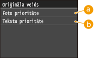 Atkarībā no drukājamā attēla varat izvēlēties oriģināla tipu. Atlasiet <Foto prioritāte> vai <Teksta prioritāte>.