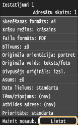 Lai rediģētu vai dzēstu jau reģistrētus iestatījumus, atveriet <Skenēšana>  <E-pasts>/<I-fakss>/<Fails>  <Izlases iestatījumi>  <Rediģēt/dzēst>  <Rediģēt> vai <Dzēst> un pēc tam izpildiet tālāk aprakstītās darbības.