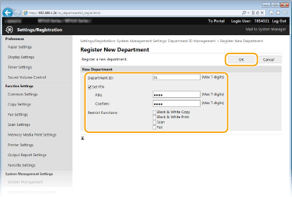 Atzīmējiet izvēles rūtiņu, lai iespējotu PIN iestatīšanu. [Department ID] (Nodaļas ID)