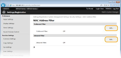 Ja MAC adreses ir ievadītas nepareizi, iespējams, nevarēsit piekļūt iekārtai, izmantojot utilītprogrammu Remote UI (Attālais lietotāja interfeiss). Šādā gadījumā <MAC adrešu filtrs> ir jāiestata kā <Izsl.>. MAC adrešu filtrs