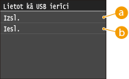 Varat deaktivizēt savienošanai ar datoru paredzēto USB portu, kas atrodas iekārtas aizmugurē. Ja šis ports ir deaktivizēts, iekārta nevar sazināties ar datoru, izmantojot USB. Šis iestatījums neietekmē priekšējo USB portu, kas paredzēts USB atmiņas ierīču pievienošanai.