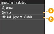 Pasirinkite <Įjungta> arba <Tik kai įvyksta klaida>