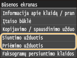 ![]() <Siuntimo užduoties žurnalas>/<Priėmimo užduoties žurnalas>Rodomas išsiųstų ir gautų dokumentų sąrašas. Kai dokumentas sėkmingai išsiunčiamas arba priimamas, rodoma <Gerai>, o kai dokumento nepavyksta išsiųsti ar priimti, nes jis buvo atšauktas arba įvyko kokia nors klaida, rodoma <Klaida>.