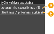 Pasirinkite <Įjungta>, kad ataskaita būtų spausdinama automatiškai kas 40 perdavimų, arba <Išjungta>, jei nenorite, kad ataskaita būtų spausdinama automatiškai.