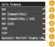 Galite pasirinkti failo formatą, kuriuo dokumentai nuskaitomi. Rinkitės iš PDF / JPEG / TIFF. Naudodami PDF galite pasirinkti stipriai suglaudintą PDF failą, kurio apimtis bus sumažinta, arba su OCR (optinis simbolių atpažinimas) paruoštą PDF failą, kuriame galima atlikti teksto paiešką.