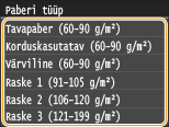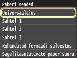 Pärast paberi vaikeseadete salvestamist ei kuvata paberi asetamisel paberi määramise kuva ja alati kasutatakse sama seadet. Kui asetate seadmesse muus formaadis või muud tüüpi paberi paberiseadeid muutmata, ei pruugi seade õigesti printida. Selle probleemi vältimiseks määrake olekuks<Määrake paberi laadimisel> ja seejärel sisestage paber.