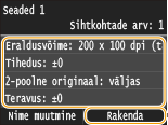 Salvestada saate kuni 18 faksisätete sageli kasutatavat kombinatsiooni. Kui valite vajaduse korral mõne salvestatud sättekombinatsiooni, pole teil vaja samu sätteid iga kord uuesti konfigureerida, näiteks kui „valite originaali kahepoolse kannimisse, selle saatmise 5 sihtkohta ja teravuse seadmise”. Sätted saate kuvada ka kiirklahvidena kuval Avamenüü .