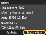 Seade saadab edasi dokumendi, mille valite kõigi mällu vastuvõetud dokumentide hulgast. Aktiveerige selle funktsiooni kasutamiseks esmalt mällu vastuvõtmise funktsioon. Vastuvõetud fakside mällu salvestamine (mällu vastuvõtmine)