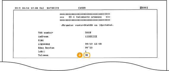 Printides vastuvõtuaruande saate kontrollida vastu võetud faksidokumentide või I-fakside logisid. Aruande saab printida, kas iga kord pärast edastuse lõppu või ainult vastuvõtutõrgete korral.