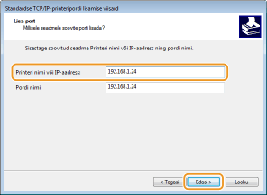 Sisestage seadme IP aadress või DNS nimi ning vajutage [Edasi].