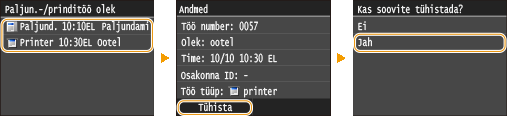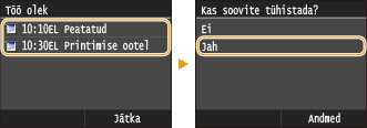 Tühistamine rakenduse Remote UI (Kaugkasutajaliides) kauduPrintimise saate tühistada rakenduse Remote UI (Kaugkasutajaliides) lehe [Job Status] kaudu. Prinditavate dokumentide praeguse oleku vaatamine