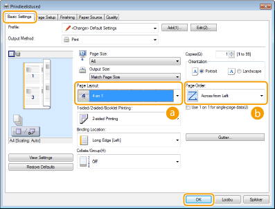 [Basic Settings] (Põhiseaded) vaheleht  Valikus [Page Layout] (Lehekülje paigutus), valige lehekülgede hulk mida soovite ühele leheküljele printida Valikus [Page Order] (Lehekülgede järjestus), valige lehtede paigutus  [OK]