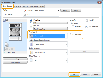 Postrisuuruse seadeid ei saa valida, kui lubatud on kahepoolne printimine. Valige [1-sided Printing] (Ühepoolne printimine) jaotises [1-sided/2-sided/Booklet Printing] (Ühepoolne/kahepoolne/brošüüri printimine) ja valige postrisuuruse seade.