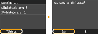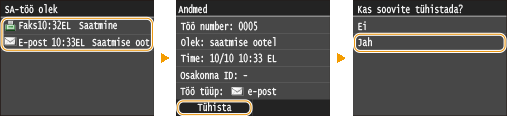 Kui soovite dokumentide saatmise kohe pärast klahvi vajutamist tühistada, vajutage kuval klahvi <Tühista> või klahvi . Dokumentide saatmise saate tühistada ka pärast saatmise oleku vaatamist.