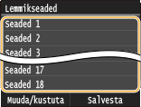 Registreeritud sätete muutmiseks või kustutamiseks minge <Skanni>  <E-post>/<I-faks>/<Fail>  <Lemmikseaded>  <Muuda/kustuta>  <Muuda> või <Kustuta> ja seejärel järgige allpool loetletud samme.