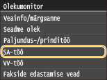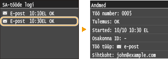 Kui seade <Kuva tööde logi> väärtuseks on määratud <Väljas>, ei saa te saadetud dokumentide logisid vaadata. Kuva tööde logi