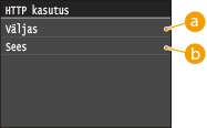 HTTP-d kasutatakse võrgu kaudu ühenduse loomiseks (nt juurdepääs seadmele Remote UI (Kaugkasutajaliides) kaudu. Kui kasutate USB-ühendust või ei kasuta HTTP-d, saate HTTP keelata, et blokeerida kolmandate isikute pahatahtlikud sissetungid kasutamata HTTP-pordi kaudu.