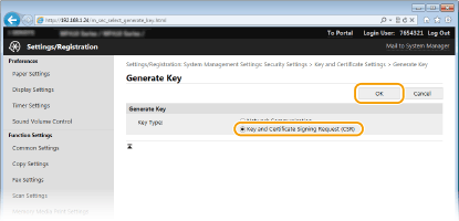 Võtmepaari saab luua seadmes kui seda on TLS (Transport Layer Security) krüptitud suhtluseks vaja. TLS'i saate kasutada, kui üritate seadmele ligi pääseda Remote UI (Kaugkasutajaliides) abil. Seadmele saab luua kuni viis (sealhulgas eelpaigaldatud) võtmepaari. Isemääratud sertifikaate kasutatakse „võrguühenduses” loodud võtmepaaridega. „Võtme ja sertifikaadi allkirjataotluse (CSR)” abil saab taotleda seadmega loodud võtmepaari jaoks sertimiskeskuse (CA) väljastatud digitaalsertifikaati.