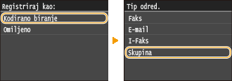 Više se odredišta može kombinirati u grupe. U grupi možete registrirati do 299 odredišta (za adrese e-pošte do 100 odredišta). Nakon registriranja grupe možete uređivati ili brisati odredišta.