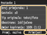 Nakon opoziva kombinacije postavki također možete promijeniti postavke kopiranja po potrebi.