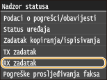 Omogućuje ispis izvješća o rezultatima primanja pri svakom pohranjivanju dokumenata u memoriju. Da biste ispisali izvješća, dodirnite <Uključeno>. Potrebno je i mogućnost <Izvješće o rezultatu RX-a> postaviti na <Uključeno>.