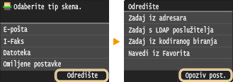 Kao odredište možete odabrati jedno od tri prethodna odredišta. Kada definirate prethodno korišteno odredište, uređaj postavlja iste postavke skeniranja kao što je gustoća koju ste koristili pri zadnjem slanju dokumenata na to odredište.