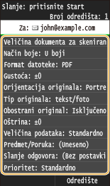 Budući da se registrirane postavke mogu prikazati prema potrebi, nisu potrebni složeni postupci (npr. postavljanje vrste dokumenta, definiranje kompaktnog PDF-a kao oblika datoteke i slanje datoteke svom internom osoblju) svaki put. Možete dodijeliti registrirane kombinacije postavki gumbu prečaca prikazanom na zaslonu Početni zaslon.