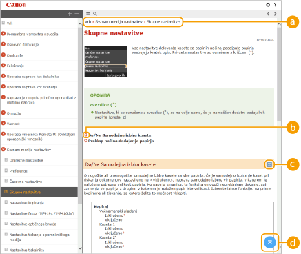 Kliknite za nastavitev parametrov, ki določajo, kako je E-priročnik prikazan, na primer velikost znakov in postavitev.