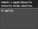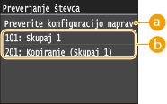), se prikaže zaslon <Preverjanje števca>. Na tem zaslonu si lahko ogledate vrednosti števca natisnjenih dokumentov ter serijsko številko naprave in konfiguracijo naprave.