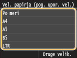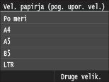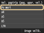 Če se ta zaslon ne prikaže, ko naložite papirČe v večnamenski podajalnik vedno naložite enak papir, lahko vsakokratno nastavljanje papirja preskočite tako, da velikost in vrsto papirja registrirate kot privzeto nastavitev. Ko registrirate privzeto nastavitev, se zgornji zaslon ne prikaže. Odprete ga tako, da izberete <Določi pri nalaganju papirja> (Registriranje privzetih nastavitev papirja za večnamenski podajalnik).