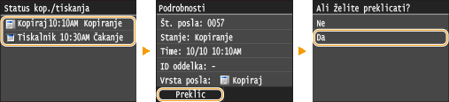 <Kopiranje/tiskanje>  <Stanje posla>  Na zaslonu <Status kop./tiskanja> izberite kopirani dokument  <Preklic>  <Da>