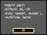 Preverite, ali je v napravo naložen papir ustrezne velikosti in vrste, ki je prikazan, in tapnite <OK>.