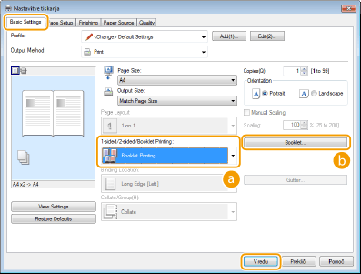 Izberite [Booklet Printing] (Tiskanje knjižice) v [1-sided/2-sided/Booklet Printing] (Enostransko/Dvostransko/Tiskanje knjižice)