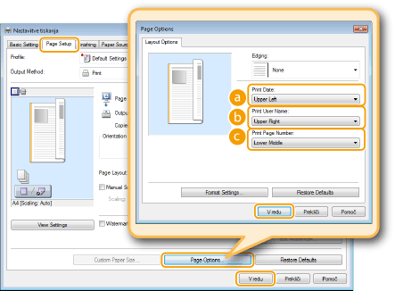 Izberite položaj tiskanja datuma, uporabniškega imena ali številke strani