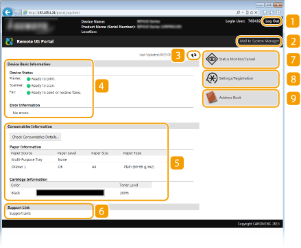 V tem razdelku so opisani običajni zasloni vmesnika Remote UI (Oddaljeni uporabniški vmesnik).
