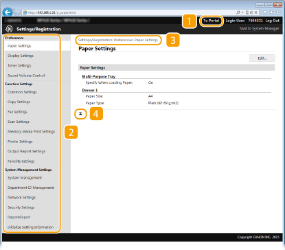Odpre stran [Settings/Registration]. Če ste prijavljeni v načinu upravitelja sistema, lahko spremenite nastavitve in registrirane podatke shranite/naložite.